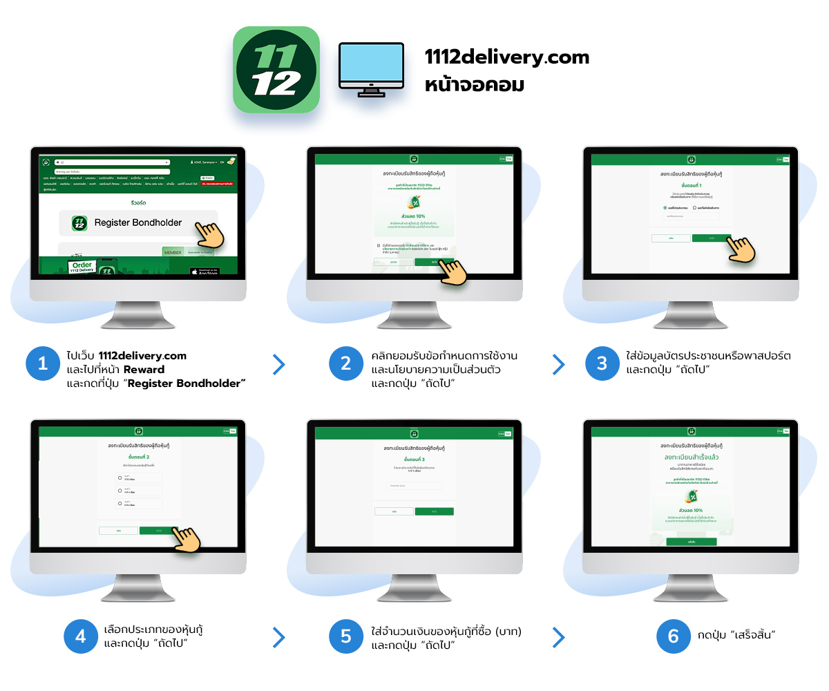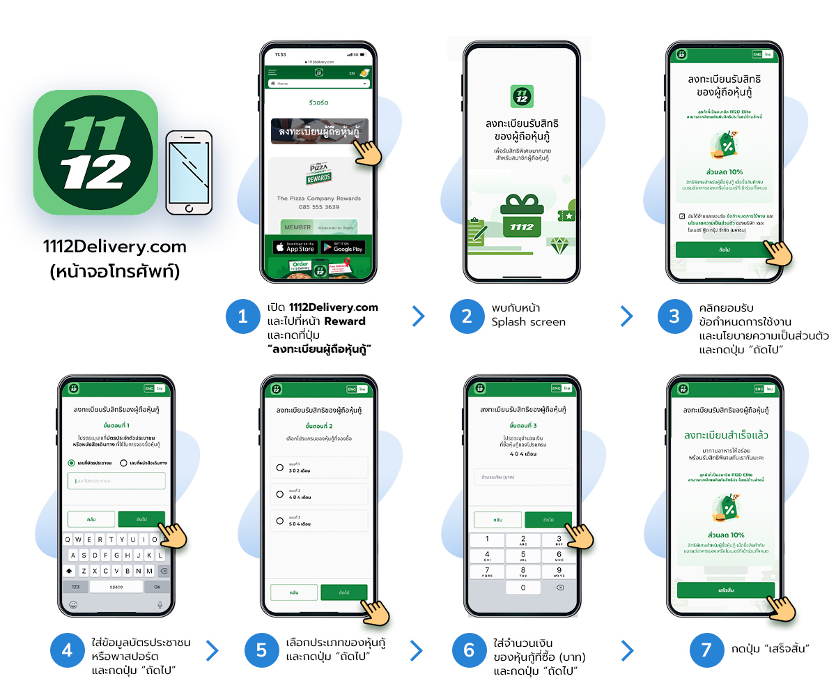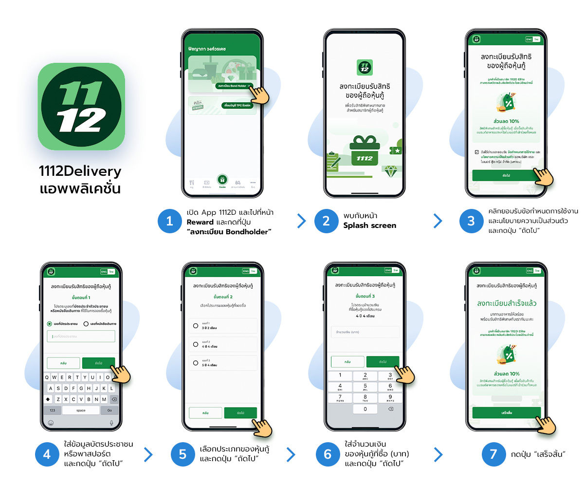 6. สิทธิพิเศษของลูกค้าผู้ซื้อหุ้นกู้ที่ทำการผูกกับบัญชีใดบัญชีหนึ่งของ 1112 เดลิเวอรี่แล้ว ไม่สามารถโอนย้ายไปยังบัญชีอื่น ๆ ได้ และไม่สามารถลงทะเบียนซ้ำได้อีก