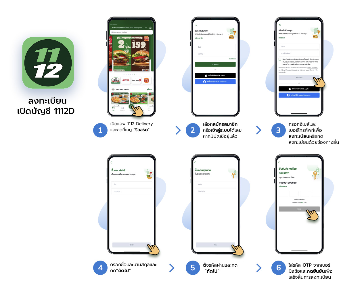 4. ลูกค้าสามารถติดตั้ง application 1112 Delivery ผ่านทาง Apple Store สำหรับระบบปฏิบัติการ iOS หรือ Play Store สำหรับระบบปฏิบัติการแอนดรอยด์ เพื่อสร้างบัญชีสมาชิก 1112 เดลิเวอรี่
