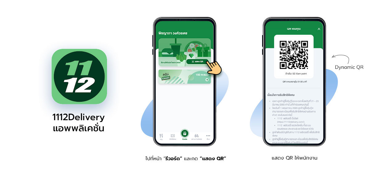 a. ผู้ถือสิทธิ์สามารถใช้งาน QR code ผ่านแอพพลิเคชั่น 1112 Delivery โดยไปที่หน้า Reward และกดปุ่ม Show QR