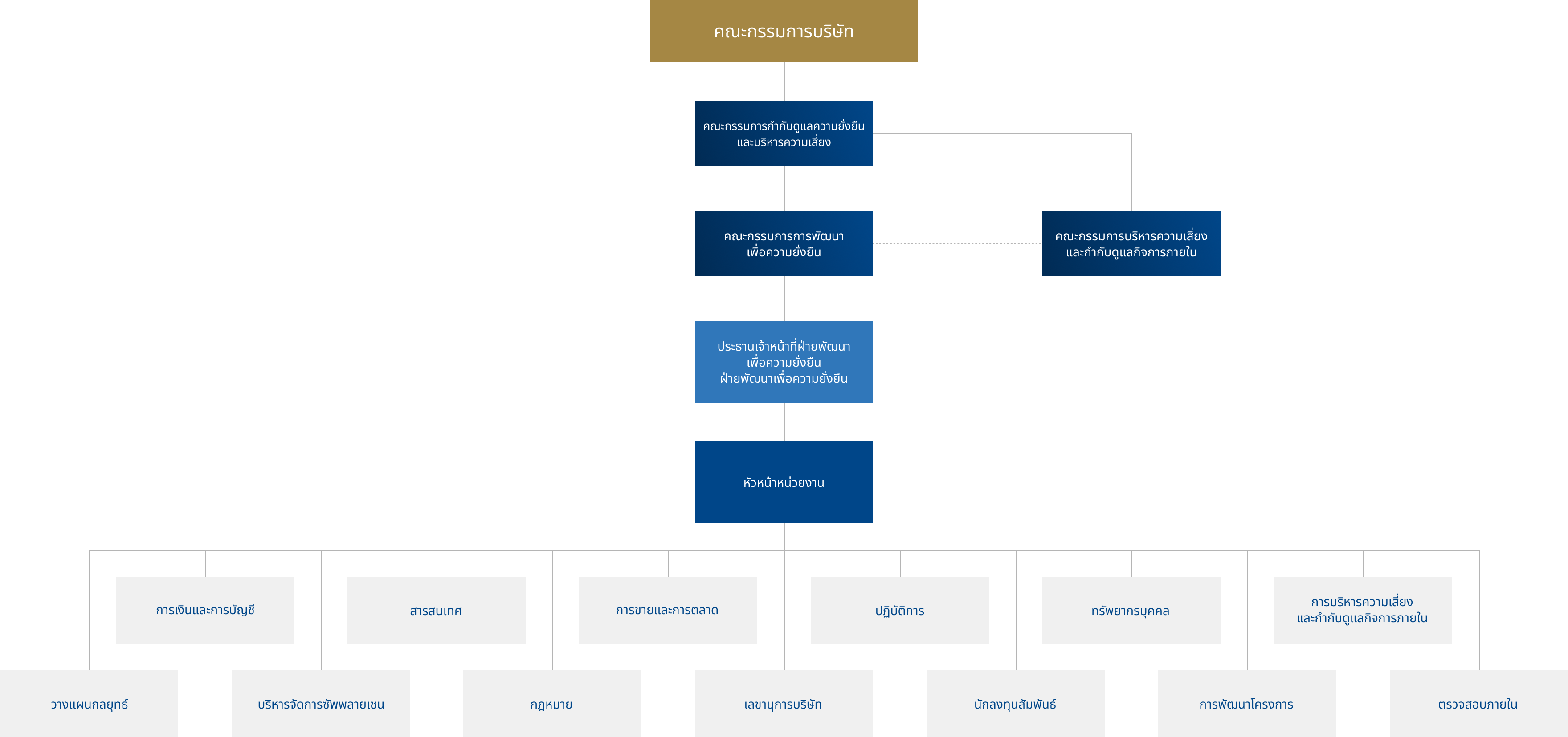คณะกรรมการการพัฒนาเพื่อความยั่งยืน (Sustainability Committee) จัดตั้งขึ้นเพื่อกำกับดูแลการพัฒนาและการดำเนินงานตามกลยุทธ์การพัฒนาเพื่อความยั่งยืนให้ครอบคลุมในทุกกลุ่มธุรกิจ โดยหน้าที่หลักของคณะกรรมการนี้คือส่งเสริมและทบทวนกลยุทธ์การพัฒนาเพื่อความยั่งยืน ตั้งเป้าหมาย กำหนดนโยบาย ตรวจสอบประสิทธิภาพ และสร้างความเชื่อมั่นในการเปิดเผยข้อมูลด้านความยั่งยืนที่มีความถูกต้องโปร่งใสตรวจสอบได้ คณะกรรมการนี้ประกอบด้วยประธานเจ้าหน้าที่และผู้บริหารระดับสูงของหน่วยงานที่เกี่ยวข้องจากทุกกลุ่มธรุกิจ และฝ่ายพัฒนาเพื่อความยั่งยืน โดยมีประธานเจ้าหน้าที่ฝ่ายพัฒนาเพื่อความยั่งยืนเป็นประธานคณะกรรมการ มีการประชุมทุกไตรมาสเพื่อหารือเกี่ยวกับแผนการดำเนินงาน ทบทวนความคืบหน้าสู่เป้าหมายด้านความยั่งยืน และจัดหาทรัพยากรที่จำเป็นในด้านต่าง ๆ ฝ่ายพัฒนาเพื่อความยั่งยืน มีหน้าที่พัฒนา ปรับปรุง และดำเนินการตรามกลยุทธ์การพัฒนาเพื่อความยั่งยืน โดยรับคำแนะนำจากผู้บริหารระดับสูงของทุกกลุ่มธุรกิจและทำงานร่วมกันอย่างใกล้ชิดเพื่อเน้นย้ำการนำหลักการพัฒนาเพื่อความยั่งยืนเข้าไปเป็นส่วนหนึ่งของการปฏิบัติงาน และช่วยให้มั่นใจว่าโครงการและการดำเนินงานด้านความยั่งยืนของกลุ่มธุรกิจมีความสอดคล้องกับกลยุทธ์และทิศทางโดยรวมของไมเนอร์ นอกจากนี้ คณะกรรมการนี้ยังสนับสนุนการติดตามและสื่อสารความคืบหน้าของโครงการและการดำเนินงานด้านความยั่งยืนจากกลุ่มธุรกิจด้วย