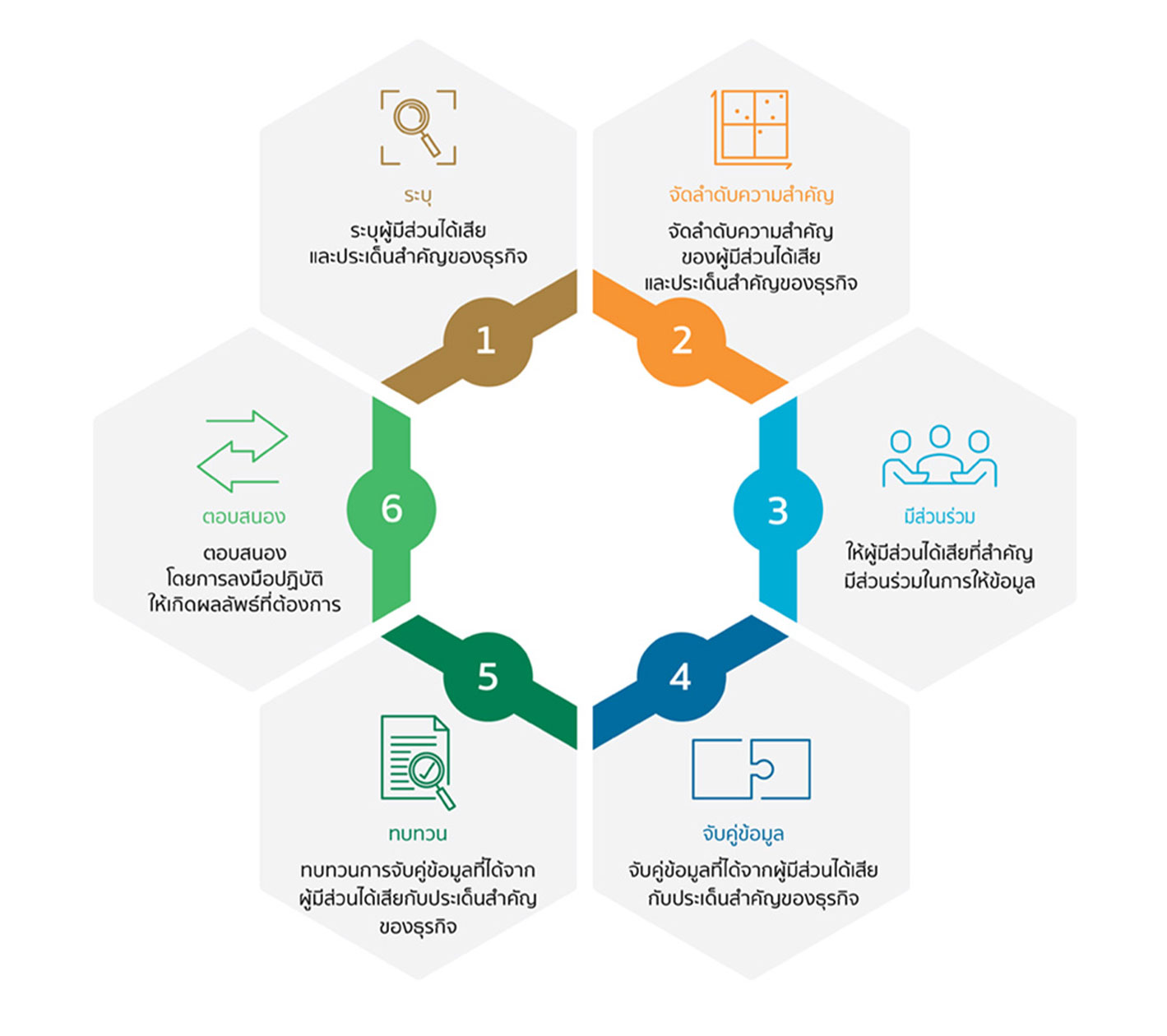 การมีส่วนร่วมจากผู้มีส่วนได้ส่วนเสียเป็นส่วนหนึ่งในการดําเนินงานของหน่วยธุรกิจของเรา โดยกระบวนการที่เราใช้ระบุและประสานกับกลุ่มผู้มีส่วนได้ส่วนเสีย ขึ้นอยู่กับระดับอิทธิพลของพวกเขารวมถึงผลกระทบที่เกิดกับหน่วยธุรกิจของเรา ตลอดจนในทางกลับกันคืออิทธิพลและผลกระทบจากหน่วยธุรกิจของเราซึ่งมีต่อพวกเขา เราใช้หลายวิธีในการประสานกับผู้มีส่วนได้ส่วนเสีย ตั้งแต่การพูดคุยแบบผ่อนคลายในแต่ละวัน การประชุม สัมมนา ไปจนถึงแบบสอบถามและการสํารวจความคิดเห็นอย่างเป็นทางการ เพื่อให้มั่นใจว่าความคาดหวังของผู้มีส่วนได้ส่วนเสียเหล่านั้นได้รับการสนองตอบอย่างมีประสิทธิภาพ